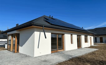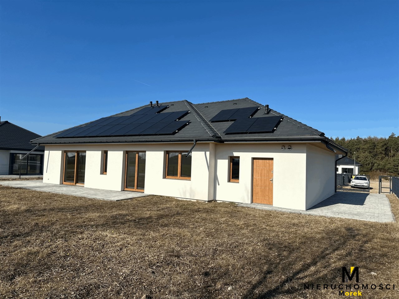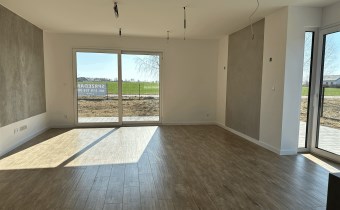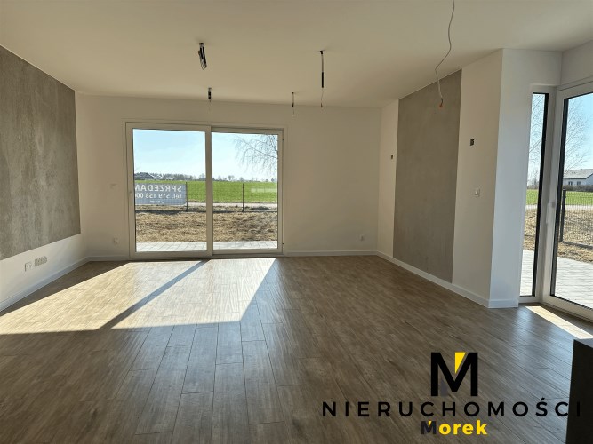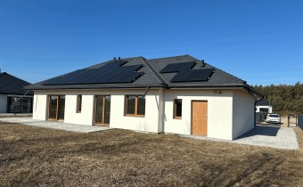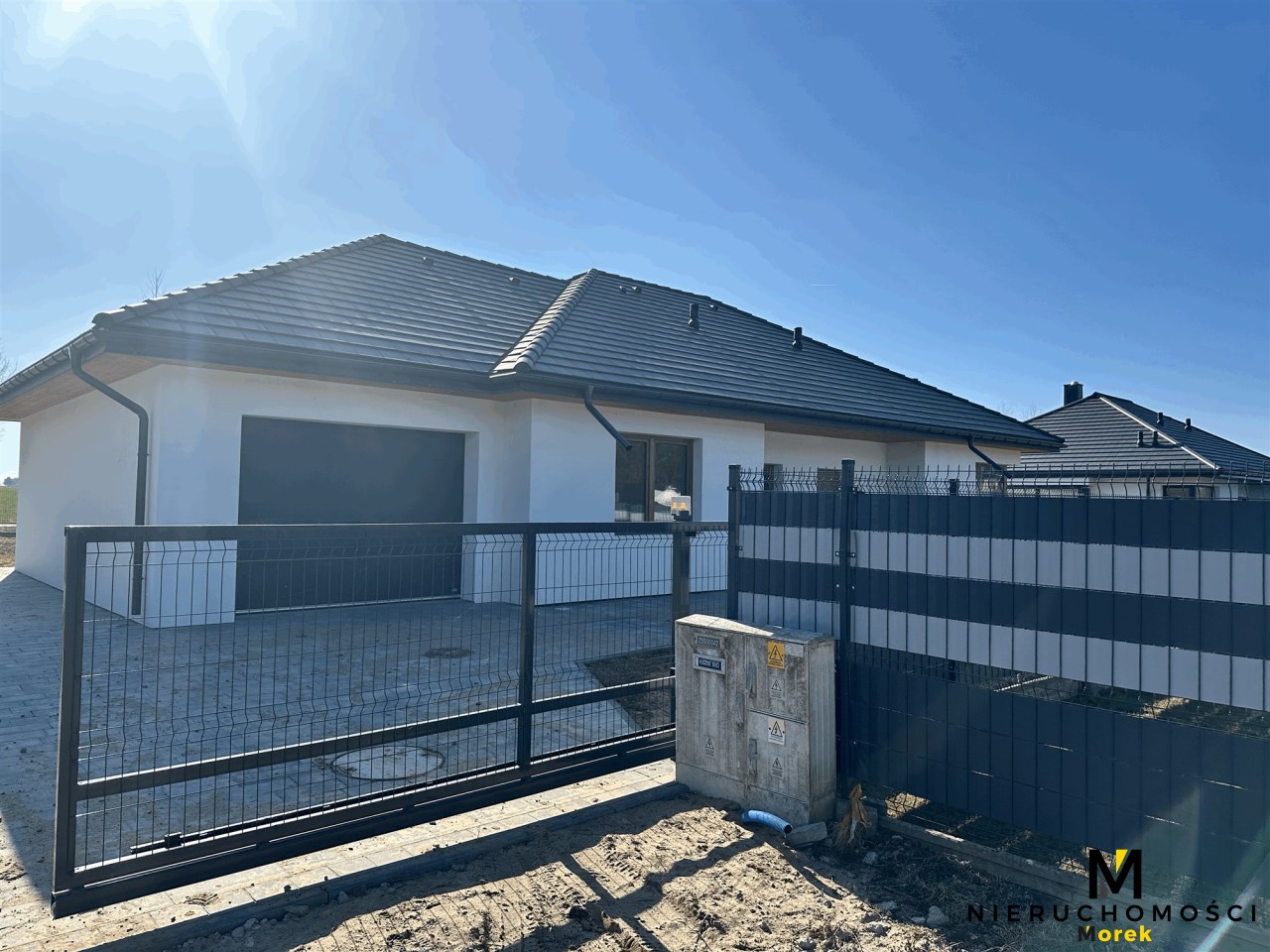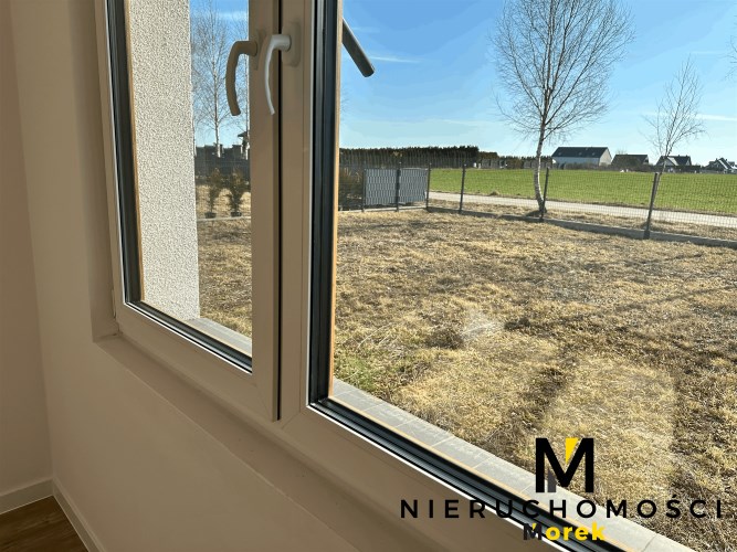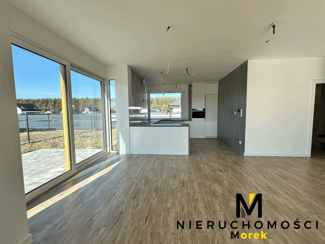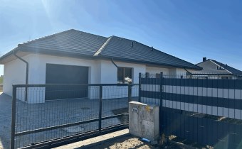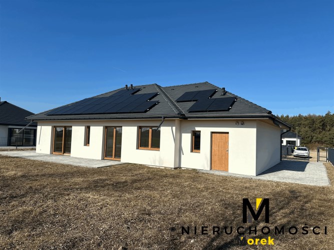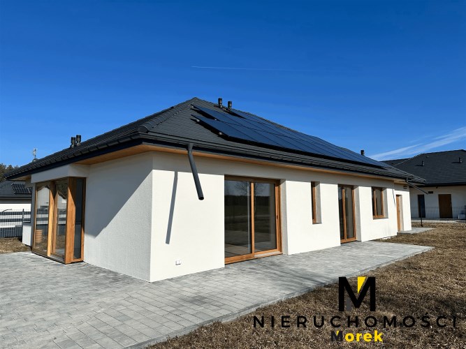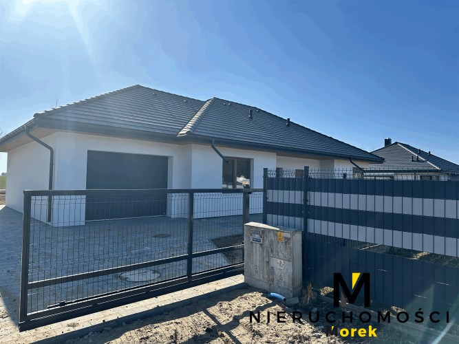 Wolnostojący, parterowy dom jednorodzinny z garażem w bryle i tarasem, ogrodzony.Wykończony pod klucz, z fotowoltaiką i ogrzewany pompą ciepła!