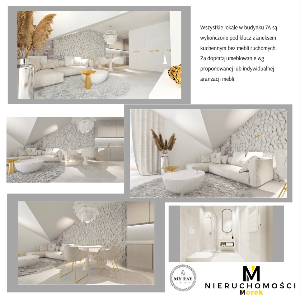Budynek apartamentowy MY BAY to kameralny obiekt, bajkowa lokalizacja, tylko 100 m. do pięknej szerokiej plaży w Zatoce Grzybowskiej , bezpośrednio przy nadmorskim deptaku w lasku sosnowym ze ścieżką rowerową., Do wszystkich lokali na parterze przydzielony jest własny ogródek, wszystkie lokale na I piętrze i poddaszu dysponuję przestrzennymi słonecznymi balkonami.