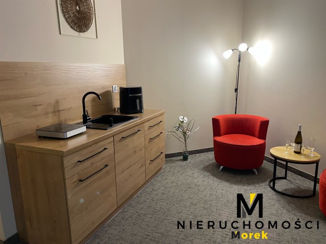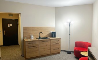 Wyposażony w standardzie hotelowym. Z dodatkowym aneksem kuchennym.