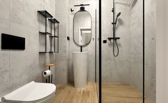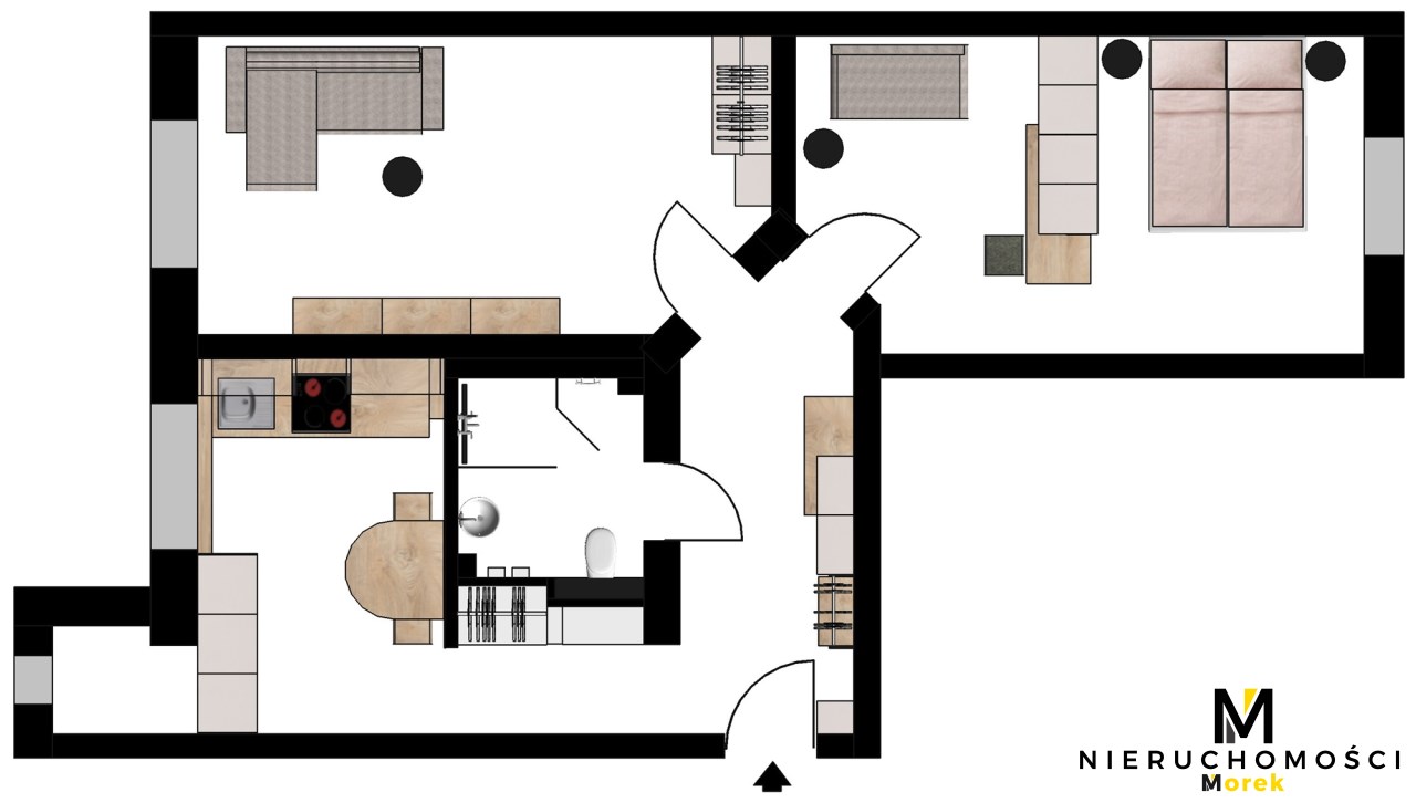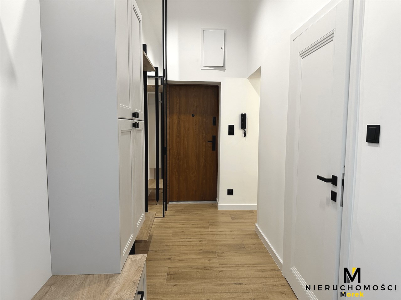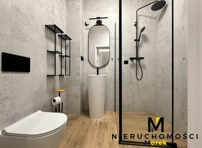 Dwa osobne pokoje oraz kuchnia ze spiżarką, zabudowy w korytarzu na pralkę, z miejscem do przechowywania, łazienka z prysznicem.