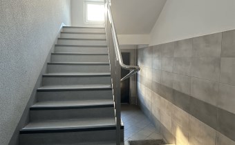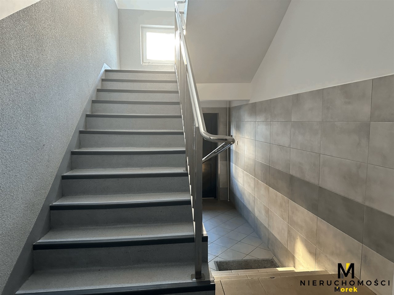 Budynek z odnowioną elewacją i klatka schodową.