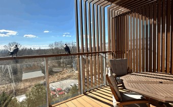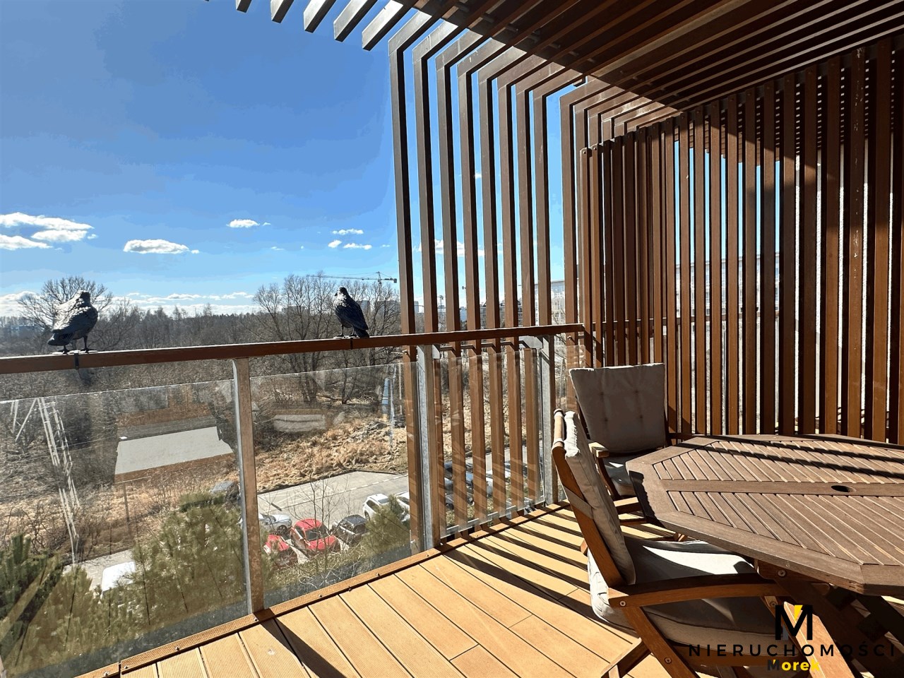 Z tarasu przyjemny widok na otaczającą, zieloną przestrzeń.