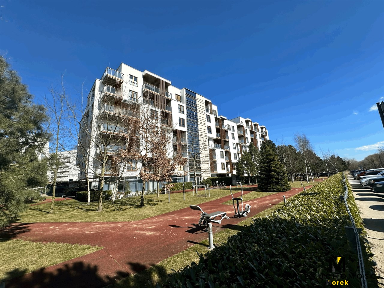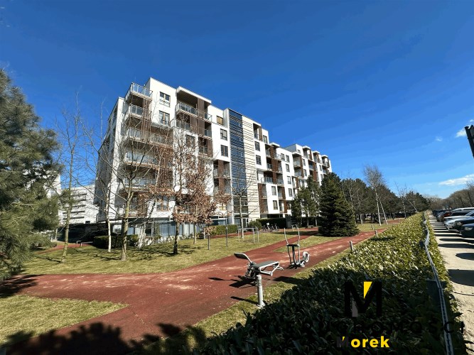 w budynku z 3 windami i zewnętrznym fitnessem oraz tartanową ścieżką do joggingu.